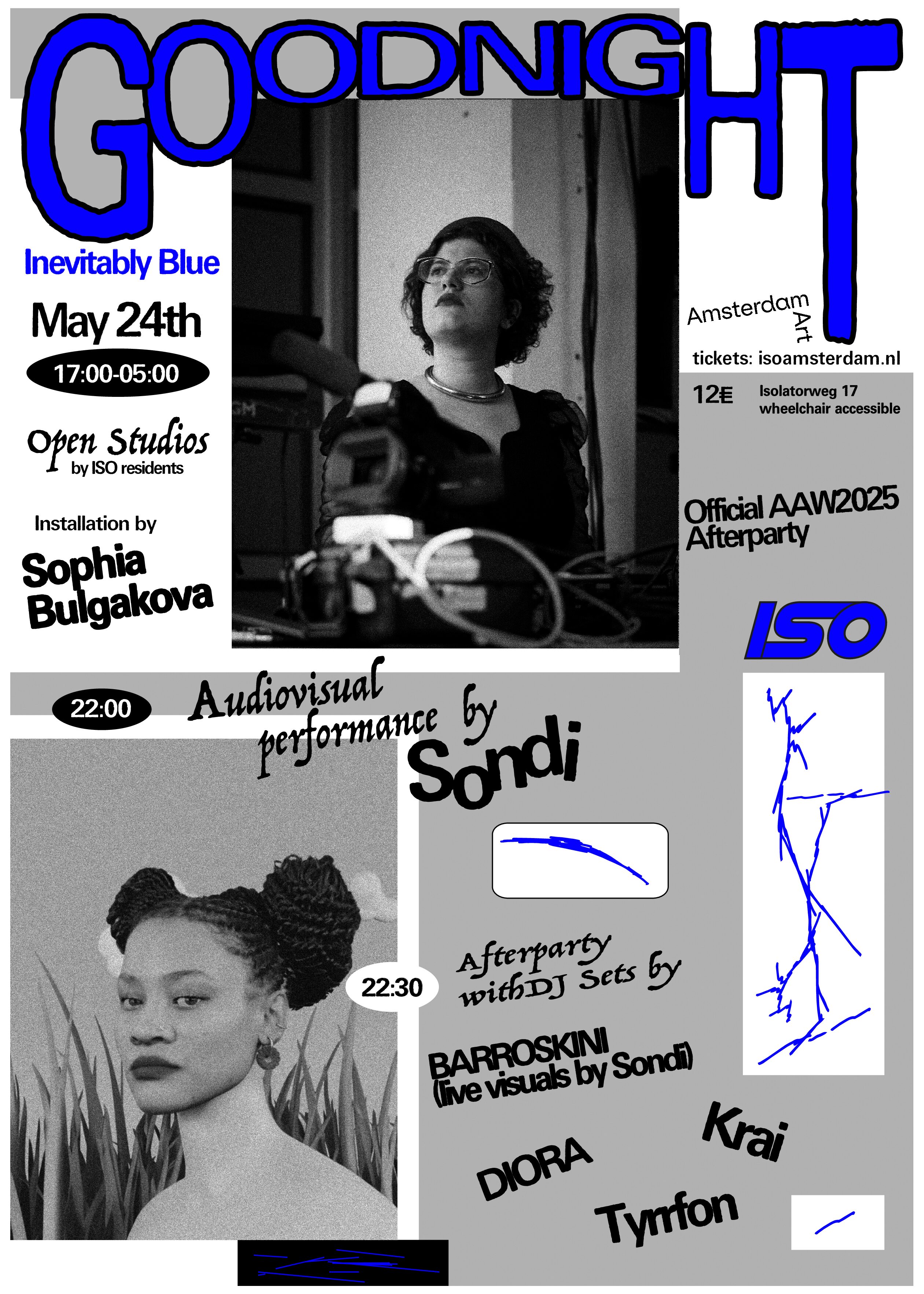 GOODNIGHT builds on previous iterations of our collaboration with Amsterdam Art Week (AAW), kicking off with a day of Open Studios from 17:00 onwards. The day will showcase the bountiful creativity and talent that resides at our lively warehouse space, inviting curious minds to pop in to meet the artists and become acquainted with their practices. Throughout the event ISO resident’s Sophia Bulgakova’s site-specific installation Inevitably Blue will be on view, providing a sublime interactive encounter for visitors where they can levitate in the landscape of shifting sensory experiences of colour. This exploratory ground will continue into the night with the official AAW2025 Official Afterparty! Integrating a touch of our ongoing Live Art Series into the AAW programme, we begin the night with an audiovisual performance by Sondi. Music and dancing will follow with DJ sets by BARROSKINI (with live visuals by Sondi), DIORA, Krai and Tyrrfon. So come early and stay late for a vibrant celebration of sound, light and movement that will continue into the early hours!
